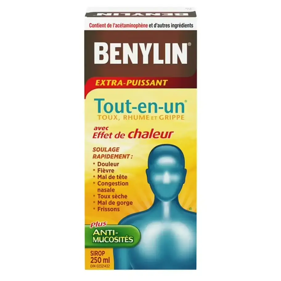 BENYLIN® EXTRA STRENGTH All-In-One® COUGH, COLD AND FLU with Warming Sensation Syrup is part of the most complete line in the BENYLIN® family of products. Its soothing properties instantly coat your sore throat while relieving all your COUGH, COLD AND FLU symptoms.