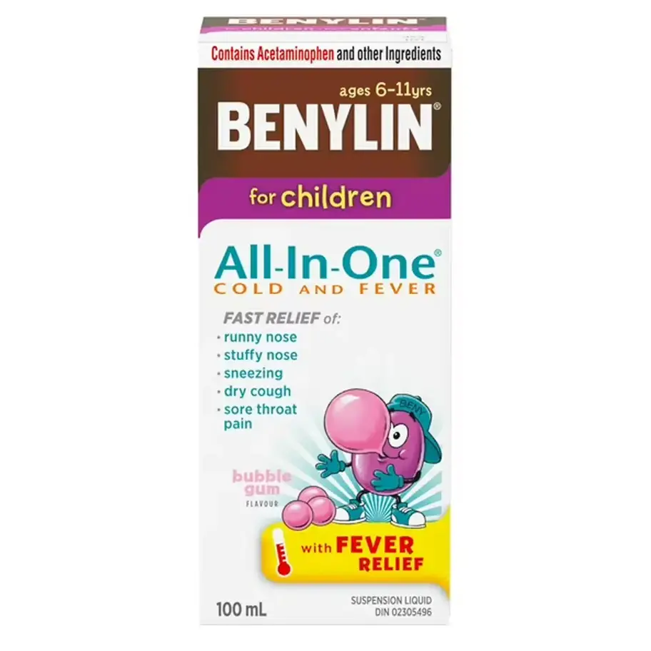 BENYLIN® For Children All-In-One® COLD AND FEVER Syrup is all-in-one solution that combines trusted BENYLIN® ingredients with a great tasting bubble gum flavour. Relieve your kids’ COLD & FEVER symptoms with 1 simple solution.